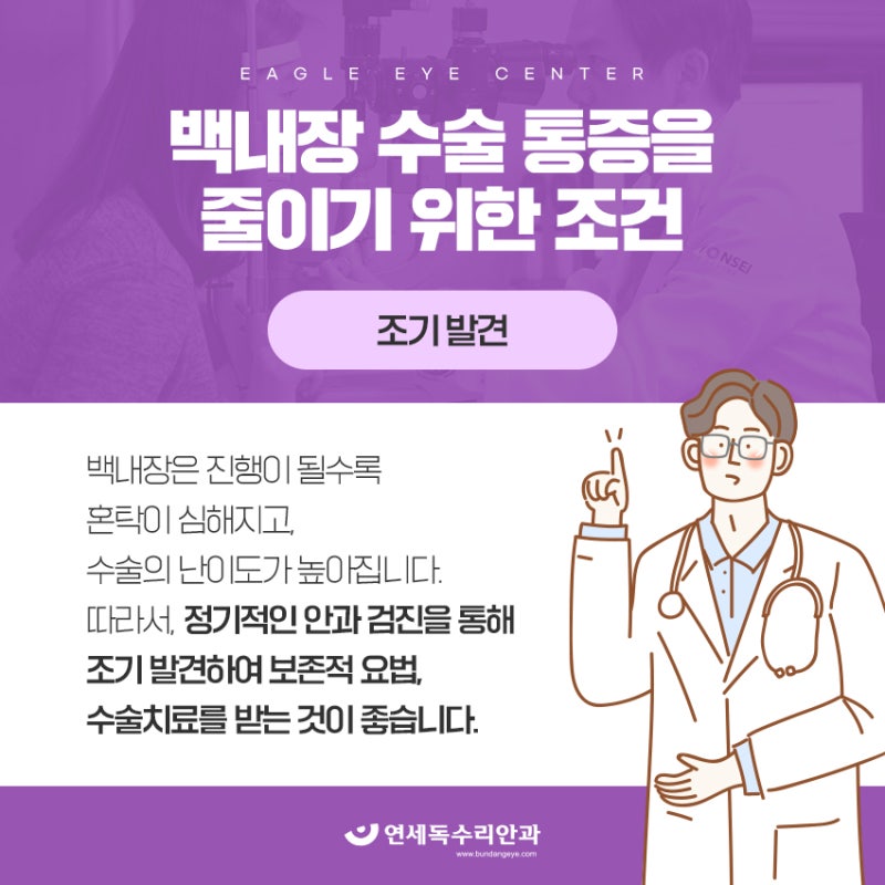 50대에 접어들었다면 1년에 한 번 정도는 눈 검사를 받을 필요가 있었습니다. 눈의 노화는 노안이나 백내장의 원인이 될 수 있기 때문이고 특히 백내장은 노화 외에도 안구 외상이나 유전, 태내 감염, 가족력, 강한 자외선 등 선천적 혹은 후천적인 요인으로 나타날 수 있습니다. 최근에는 높아진 전자기기 사용량이 눈에 영향을 미쳐 비교적 이른 시기에 노안이나 백내장이 발생하기도 했습니다. 누구나 경험할 수 있는 증상이므로 조기에 발견하고 치료까지 병행하는 것이 적절한 대응이었습니다.