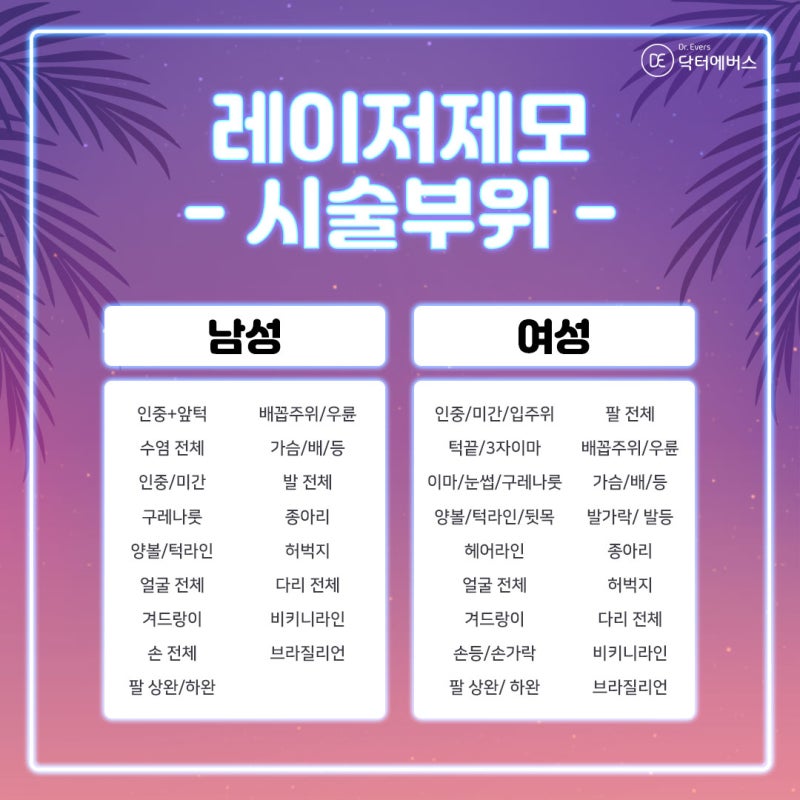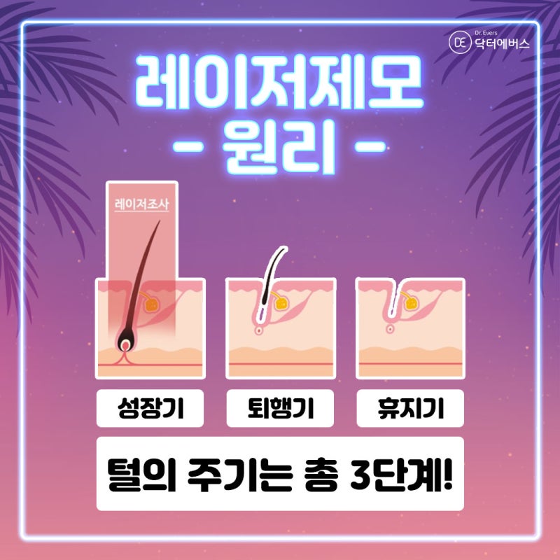 먼저 에버스 레이저제모의 원리에 대해 알아보겠습니다! 우리 몸에서 자라는 모발은 성장기/퇴행기/휴지기의 3단계로 나뉩니다. 레이저 제모의 원리는 모낭과 모근 성장 단계를 제거하는 것입니다. 모발의 성장주기마다 다르기 때문에 주기에 따라 여러번 시술을 받으시면 제모효과가 더욱 좋아지실거에요! 그렇다면 겨드랑이 레이저 제모 주기는 어떻게 되나요? 4~6주 간격으로 5~10회 이상 여러 번 치료하는 것이 좋습니다. 겨드랑이 레이저 제모의 주기와 횟수에 따라 치료를 받으면 반영구적인 효과까지 느낄 수 있습니다. 모든 모발의 모낭과 모근을 제모하고 모발의 성장을 최소화해야 하므로 주기에 따라 여러 번의 시술을 권장합니다! 반영구적인 효과를 원하시면 주기와 횟수를 맞춰주세요. 서울대학교에서는 겨드랑이 제모 외에도 다양한 부위의 털을 제거할 수 있습니다! 남자와 여자는 제모의 종류에 따라 조금씩 다르지만 거의 모든 부위에 시술이 가능합니다. 이미 탈모로 고민이신 분들은 유명 탈모 닥터에버스의 상담을 받아보세요! 세심한 진료를 진행하고 있습니다~ 음주와 마찬가지로 일주일 정도 금연을 해주세요! 가벼운 걷기는 괜찮지만 땀을 흘리게 하는 격렬한 운동은 피하십시오. 또한 자극적인 사우나, 찜질방도 피하세요. 여성 제모 5회 25,000원 할인! 제모 올벤트는 여성뿐만 아니라 남성에게도 좋습니다! 남성 겨드랑이 제모 시술 5배 5만원의 합리적인 혜택! 겨드랑이 부위 뿐만 아니라 남녀 각 부위별로 5가지의 특별한 혜택이 준비되어 있습니다. 다른 부위 혜택이 궁금하시다면 올벤트 밑털제모 배너를 확인해보세요! 지금까지 Ziggy Evers에서 레이저 제모에 대해 알아야 할 모든 것을 배웠습니다. 누구나 닥터에버스 서울대학교를 방문하기 전에 예약을 해야 합니다. 잘 해결되길 바라며 포스팅을 마치겠습니다. 감사해요. 네이버 예약 ▼