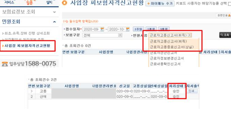 접수일을 대충 설정하는, 예를 들어 5월 퇴사했다면 5월 사이에 기간을 설정하고 오른쪽 탭에서 근로자격 ‘상실’ 신고서를 클릭한다, 퇴사를 확인하려면 상실 탭에 들어가야 확인할 수 있다. 처리 상태에 승인이 되어 있으면 퇴사 처리가 완료된 민원임을 확인하는 것이다.