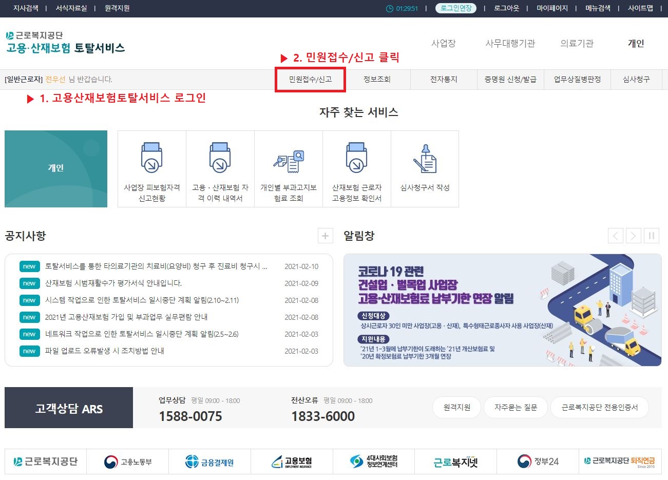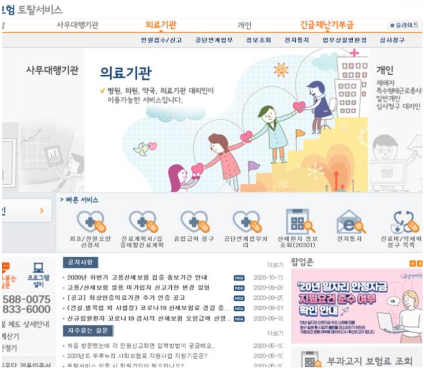 근로복지공단 고용·산재보험 토탈서비스 자주찾는 서비스 토탈서비스 이용안내서 다운로드 사업장/사무대행기관 보수총액신고부과 고지 보험료조회 일자리안정자금 관련 신고화면 안내 일괄적용 사업개시 신고 근로자자격취득 신고 근로내용확인 신고 예술인·노무제공자 취득신고 고용보험 노무제공자 월 보수액 통지 의료기관 최초/의료기관 변경 요양신청서 진료계획서/집중재활진료계획서 휴업급여청구 요양비청구공단 연계업무처리 산재환자정보조회 전자통지진료비/약재비청구목록 개인사업장 피보험자격신고현황 고용·산재정보조회 정보조회 정보