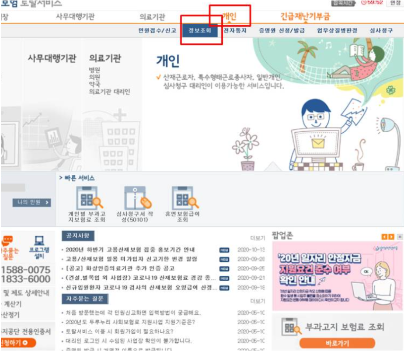 접속하면 이런 시작화면이 뜨는데 그 중 오른쪽 상단 개인탭에서 정보조회에 들어간다.