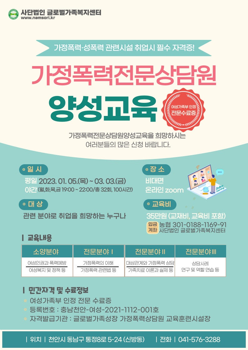 (여성가족부 100시간) 성폭력상담원 양성교육 수강생(월/수/토 선택가능)(상시모집)(여성가족부 100시간) 가정폭력상담원 양성교육 수강생(수/토 선택가능)(상시모집)–여성가족부 100시간 가정폭력상담원 양성교육 성폭력가정폭력전문상담원 양성교육(여성가족부100시간)(월/수/토 선택가능)(0월반)(모집중) 성폭력가정폭력전문상담원 양성교육(여성가족부, 월수부, daum.net